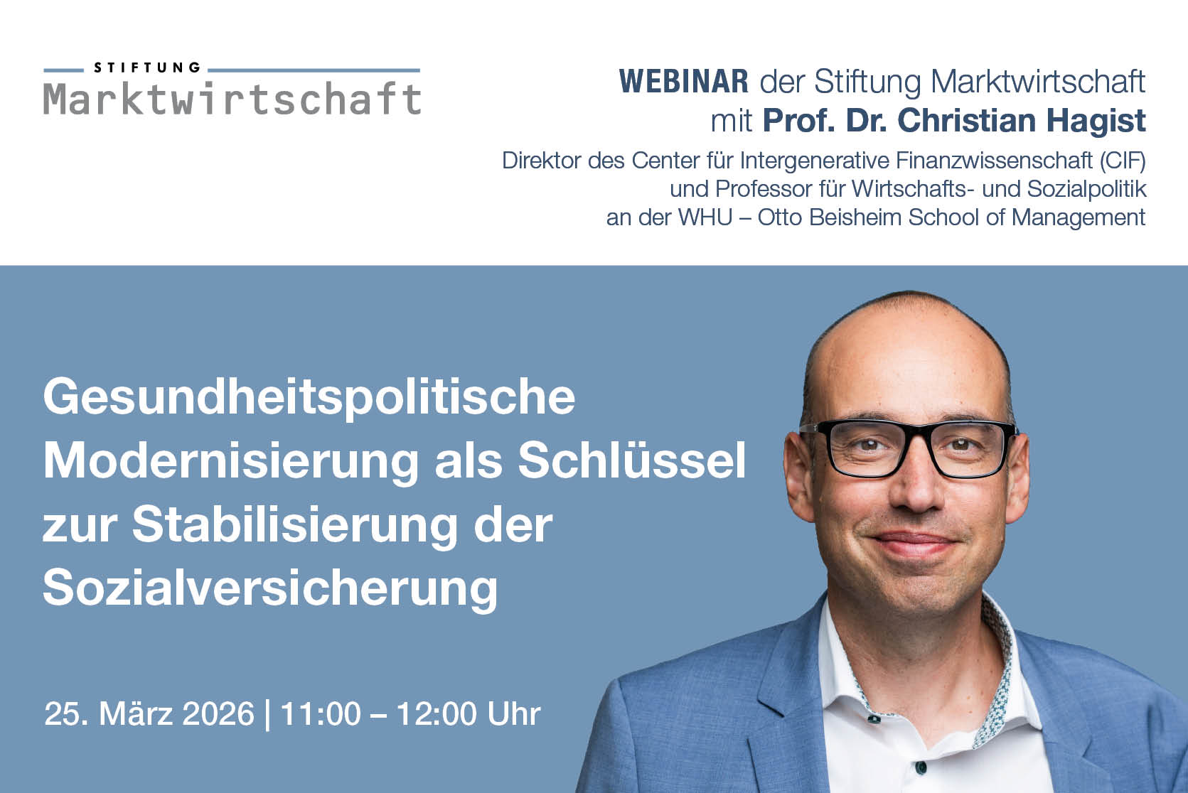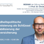 Vor diesem Hintergrund wird Prof. Dr. Christian Hagist die zentralen Herausforderungen im deutschen Gesundheitssystem skizzieren und aus marktwirtschaftlicher Perspektive aufzeigen, welche Reformansätze unser Gesundheitssystem dauerhaft funktionsfähig und bezahlbar machen könnten.