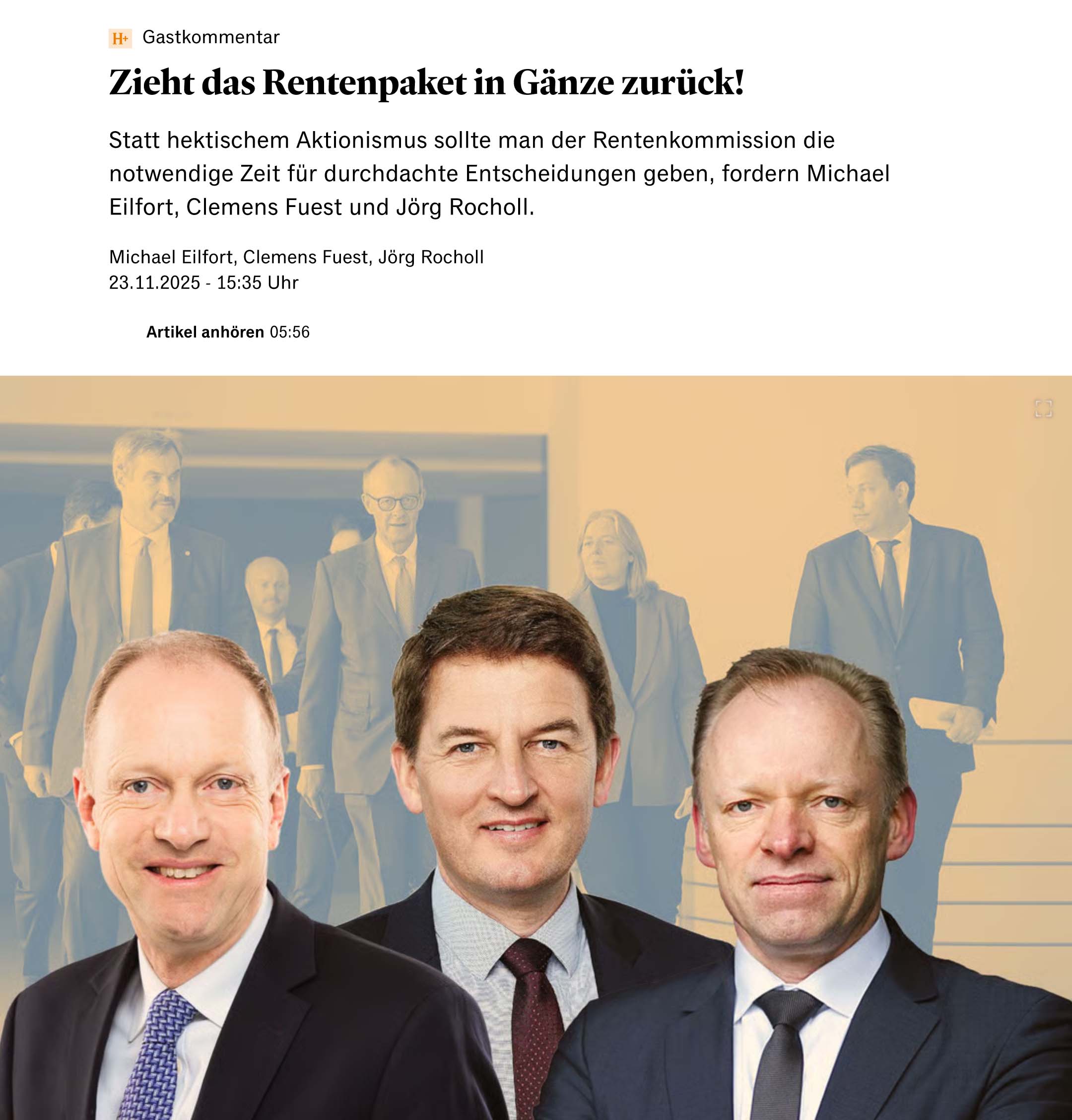 Prof. Dr. Michael Eilfort, Vorstand der Stiftung Marktwirtschaft, Prof. Dr. Dr. h.c. Clemens Fuest, Präsident des ifo Institut und Mitglied des Kronberger Kreises, und Prof. Jörg Rocholl PhD, Präsident ESMT Berlin, fordern „Zieht das Rentenpaket in Gänze zurück“ in einem Gastkommentar für das Handelsblatt am 23.11.2025.