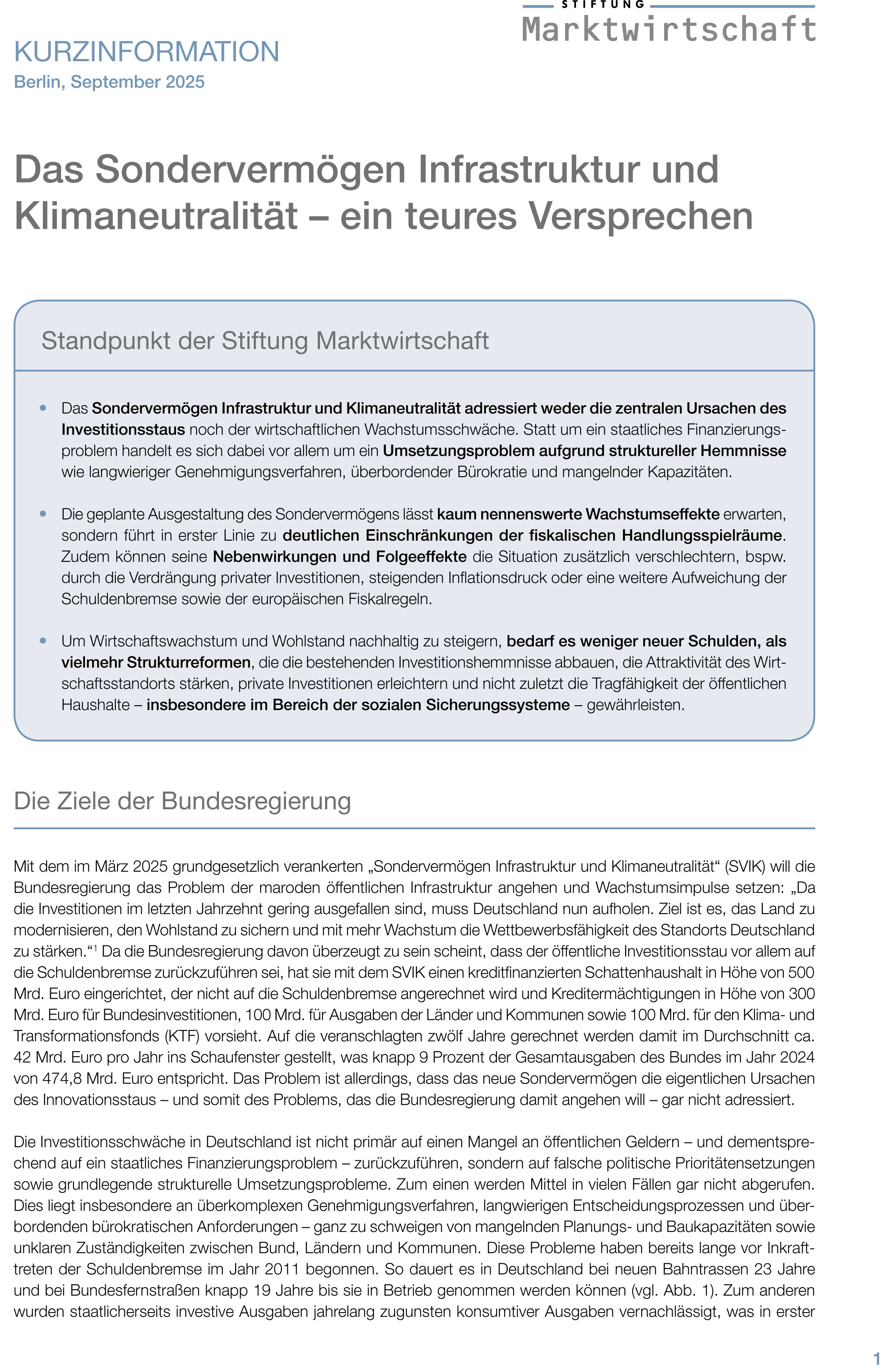 Das Sondervermögen Infrastruktur und Klimaneutralität adressiert weder die zentralen Ursachen des Investitionsstaus noch der wirtschaftlichen Wachstumsschwäche. Statt um ein staatliches Finanzierungsproblem handelt es sich dabei vor allem um ein Umsetzungsproblem aufgrund struktureller Hemmnisse wie langwieriger Genehmigungsverfahren, überbordender Bürokratie und mangelnder Kapazitäten.